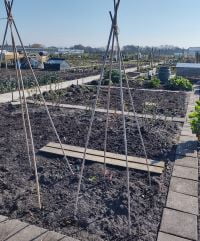 Ik had beloofd nog een foto te nemen van de bamboestokken die ik geplaatst heb voor bij mijn doperwten. Bij deze dus de foto. Ik heb vier stokken in de grond gestoken. Ongeveer even ver uit elkaar. De bovenkant van de stokken heb ik samen gebonden met een touwtje. Je kan dit ook met drie stokken doen, of met vijf, misschien wel met zes. Dat is gewoon uitproberen. Vorig jaar heb ik gemerkt dat dit een stevige constructie is en makkelijk in elkaar te zetten. Daarom bouw ik ze dit jaar weer.