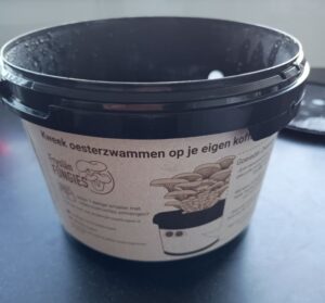 Voor kerst kreeg ik een kweekset cadeau, compleet met een handig emmertje en een portie broed. Mijn taak? Alleen koffieprut toevoegen. Elke dag een beetje, net zolang tot het emmertje vol is. Dan begint het grote wachten: over een paar weken zouden de eerste zwammen moeten verschijnen. Spannend!