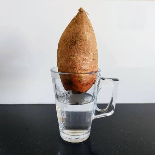 Deze week heb ik ook mijn zoete aardappel opgestart. Ik heb gewoon een zoete aardappel uit de supermarkt op water gezet. Hier gaan dan wortels aangroeien. Daardoor gaat de knol groene plantenscheuten vormen. Wanneer die ongeveer 10 centimeter zijn, dan knip ik die voorzichtig van de knol af en zet ze in een glas met water. Daar vormen de scheuten wortels en kunnen ze naar verloop van tijd in een potje met aarde. Wanneer het volop zomer is dan mogen deze plantjes in de volle grond. Wel een plek met veel ruimte, want de zoete aardappel is een winde. Hij krioelt door je hele tijd. Maar dat is zeker de moeite waard. Want voor de eerste nachtvorst in november mag je gaan oogsten. Als het goed is zijn er dan hele mooie nieuwe knollen gevormd waarmee we weer heerlijke maaltijden kunnen bereiden.